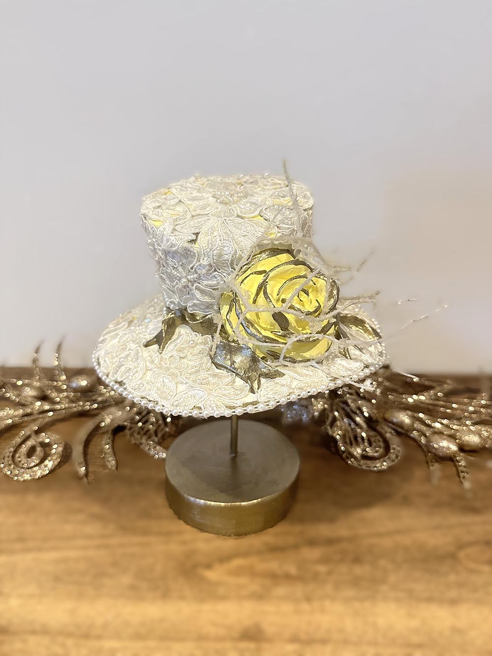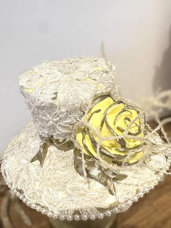 . Beyaz Fransız dantelli boncuk ve beyaz dallarla süslenmiştir.